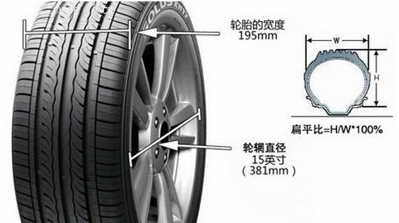 國際標準的輪胎規格,一般由六部分組成,“輪胎寬度(mm)+輪胎斷面的扁平比(%)+輪胎類型代號+輪輞直徑(英寸)+負荷指數+許用車速代號”。輪胎寬度、輪輞直徑及扁平比如上圖所示,其中扁平比為胎厚與胎寬的百分比。